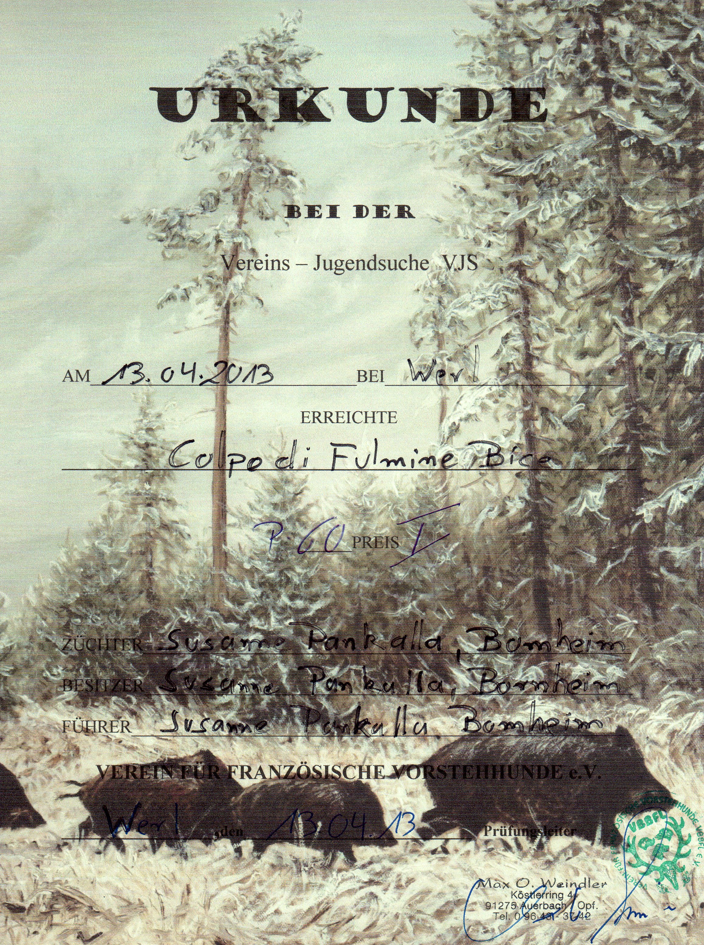 Es handelt sich wie bei der Verbands-Jugendprüfung (VJP) um eine reine Anlagenprüfung. Bice erhielt in allen Fächern (Nasengebrauch, Suche, Vorstehen und Führigkeit) die Bestnote 10 und wurde mit insgesamt 60 Punkten und I. Preis ,Suchensieger‘. Ein schöner Erfolg!