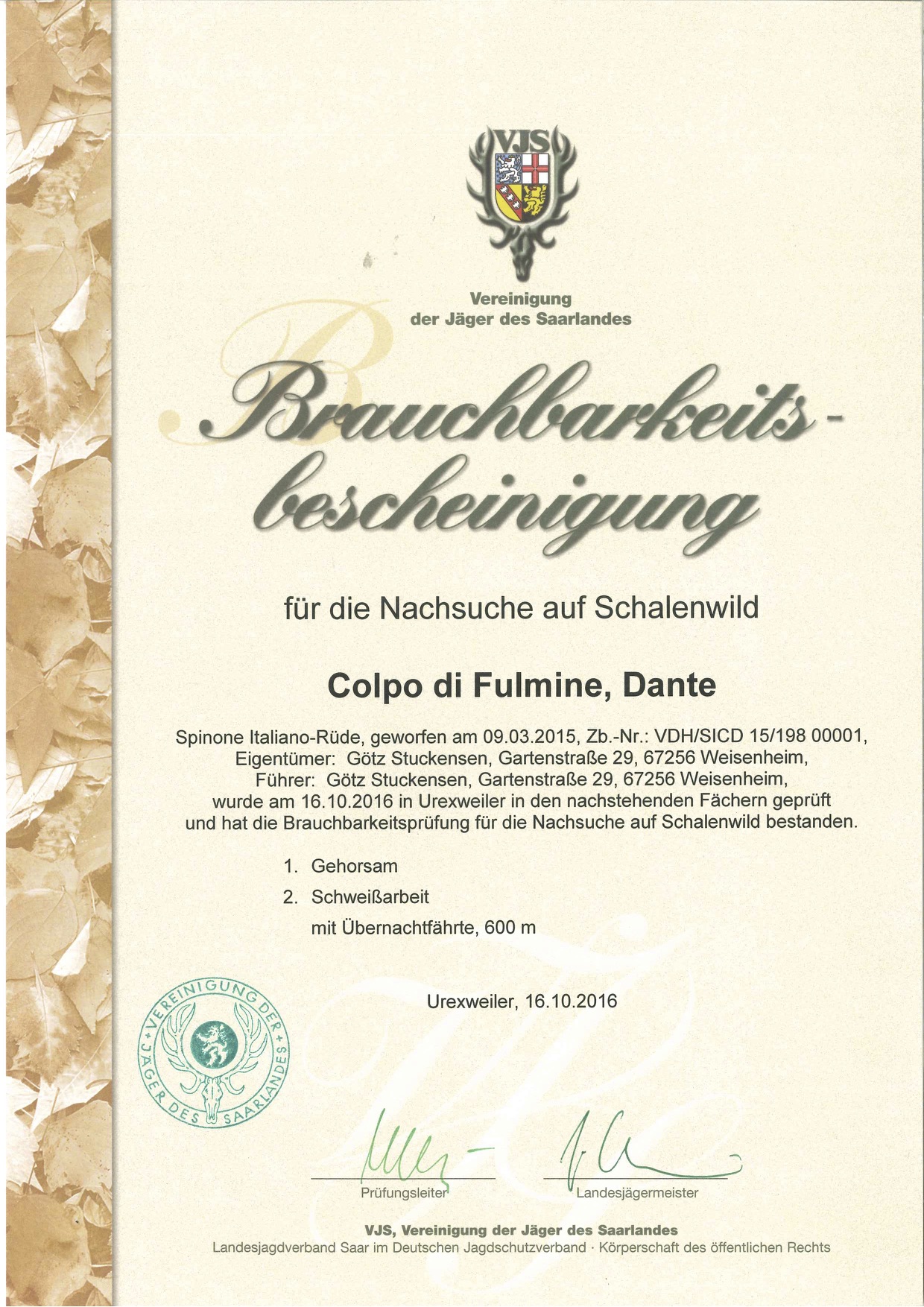 16.10.2016: Ein riesiges Kompliment an Dante für die bestandene Brauchbarkeit auf die Nachsuche auf Schalenwild. Weiter so!!!!!