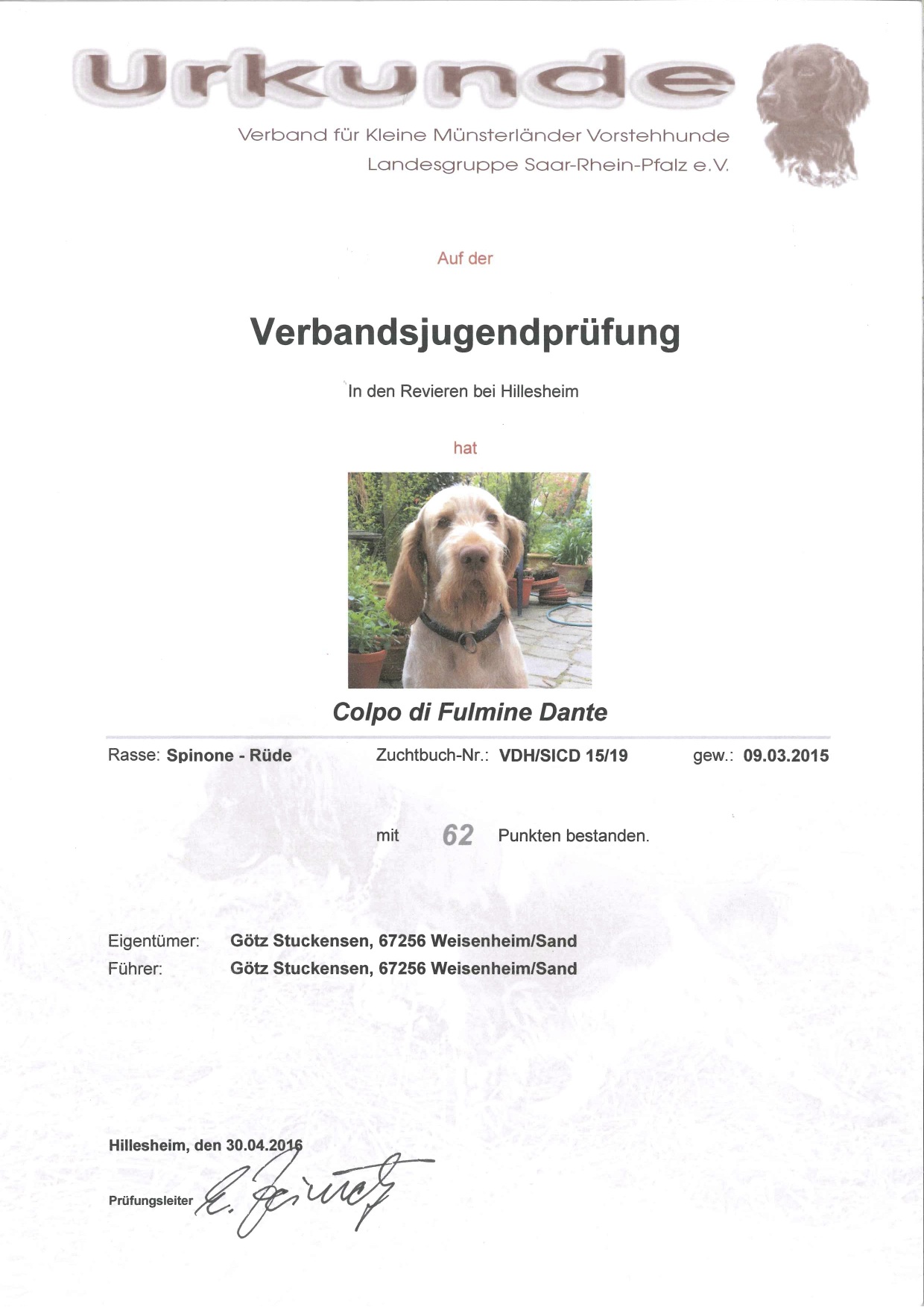 Verbands-Jugend-Prüfung 2016: Am 9. April hat unsere Jüngste, Colpo di Fulmine Didone, die VJP mit 68 Punkten erfolgreich bestanden. Es war die erste VJP, die der Spinone Italiano Club Deutschland e.V. (SICD e.V.) nach Anerkennung der Rasse Spinone Italiano seitens des JGHV organisiert hat. Es haben 5 Hunde, davon 4 Spinoni teilgenommen. Alle Hunde haben bestanden, Didone war die Beste unter den Spinoni. Herzlichen Glückwunsch an alle und besonders dem Team Jens und Didone 👏