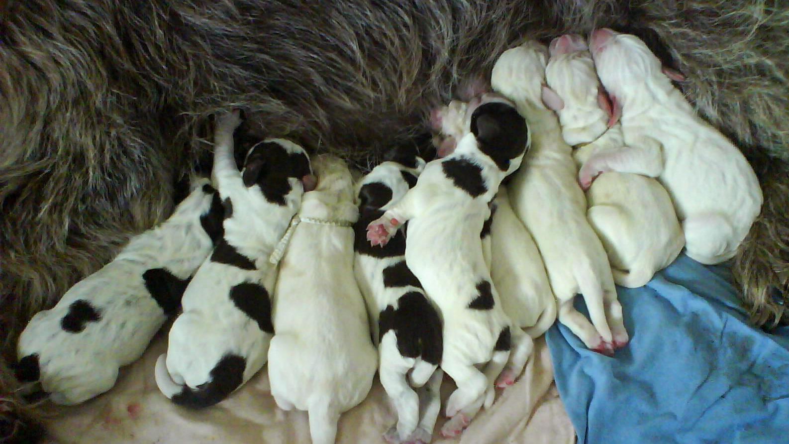 19. Februar 2010: Ciara‘s Welpen sind da: 3 Rüden (2 w/o, 1 b/s), 7 Hündinnen (3 w/o, 4 b/s).