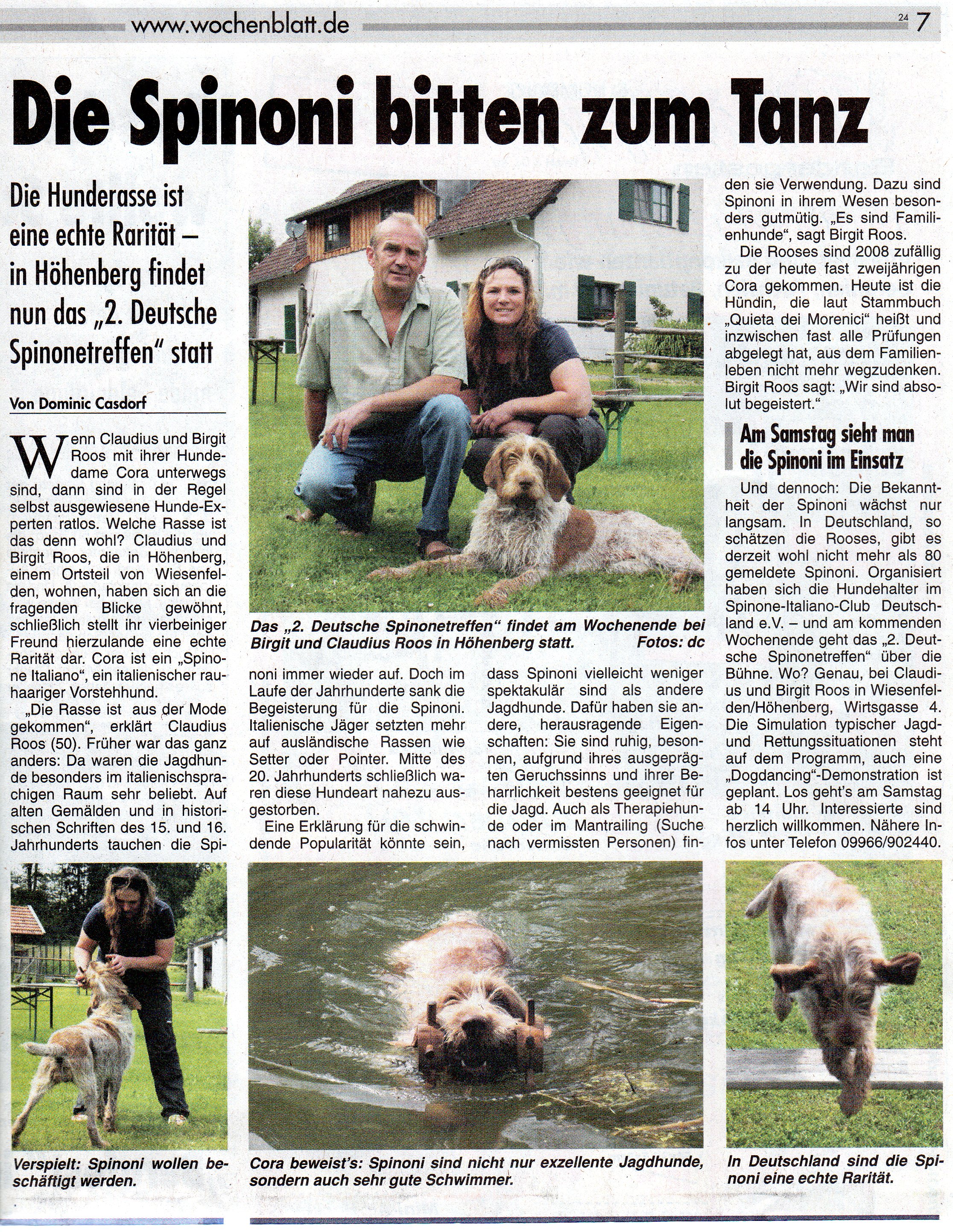Am 19.06.2010 fand das 2. Treffen des Spinone Italiano Club Deutschland statt. Birgit und Claudius Roos hatten alles super organisiert und es war ein rundherum harmonisches Zusammensein. Wir hatten viel Gelegenheit zum Austausch und bewunderten unsere Hunde bei der Schweiß-, Schleppen- und Wasserarbeit, der Rettungsarbeit und nicht zuletzt beim Dog-Dancing (mehr unter ,Fotoalben‘). Ein besonderer Dank gilt den Gastgebern!!!